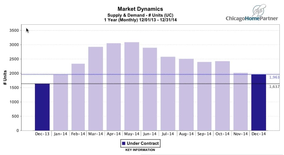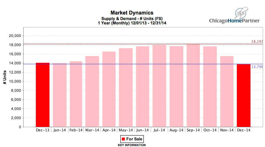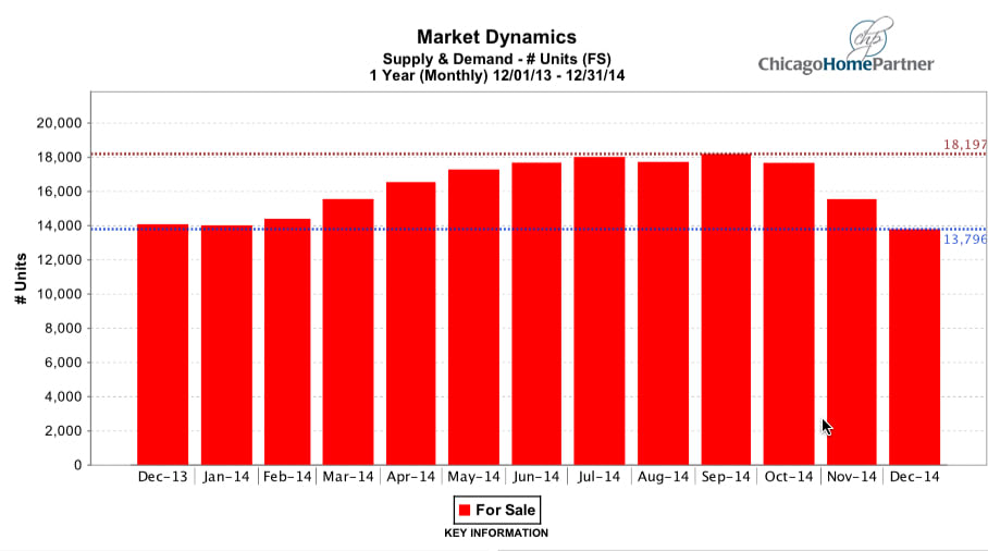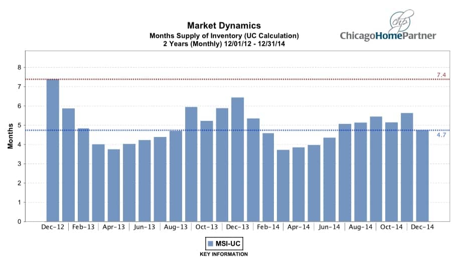 Locally: Where our end of year numbers show an increase in much needed inventory for the Chicago North Side neighborhoods (2014 year end average 4.7 MSI), we actually started the year with a lower level of inventory (near 5.4 MSI), down from January of 2013 (5.9 MSI).