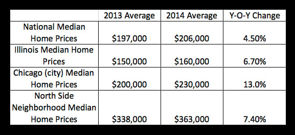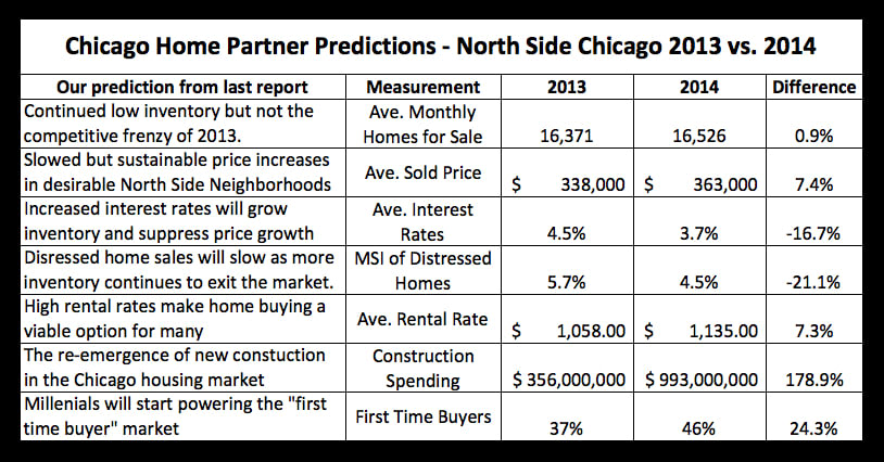 Below you’ll see our predictions for the 2014 market specific to the North Side region of the city as well as final year-end numbers. As you can see, we were pretty spot on with our insight, only being baffled by the interest rates – which threw most experts for a loop last year.