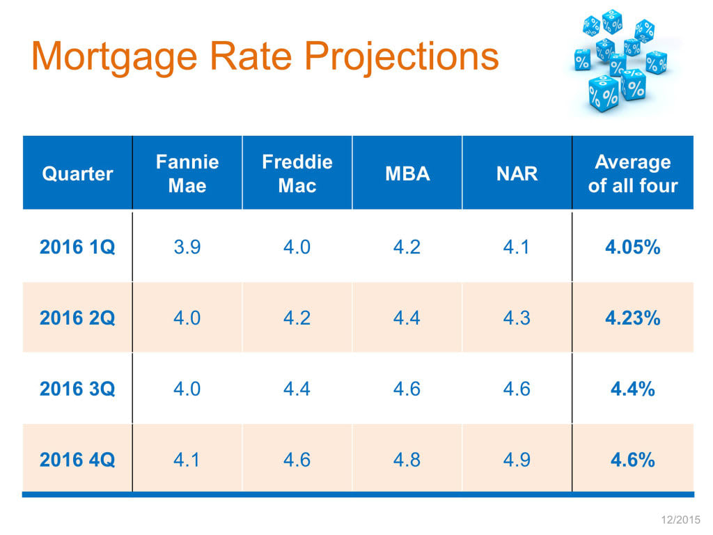In a recent press release that included predictions from Fannie Mae, Freddie Mac, MBA and the National Association of Realtors, all made their predictions on where consumer mortgage rates will be throughout 2016. As you can see below, all stated a marginal increase of .6% by year end 2016.