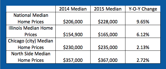 Nationally: For the second year in a row, homeowners in the United States should be pleased with the results of 2015. The median home price in the nation rose nearly 10% last year from $206,000 to $228,000 and Illinois as a whole appreciated just over 6%. This is great news for homeowners panic stricken during the downturn years of 2007-2012, allowing many to finally exit their homes without turning to short sales or foreclosures.