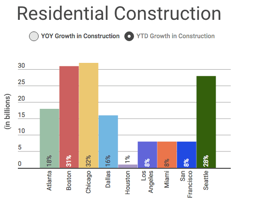 Looking towards 2016, we can only expect this number to grow exponentially along side the appreciation of median home values. In the 4th quarter, Chicagoland’s year-to-date new construction spending was $4.034 billion, a 32 percent increase over the same time period in 2014. This places Chicago at the top of the chart for new construction spending against competitors such as Boston, Dallas and Seattle.