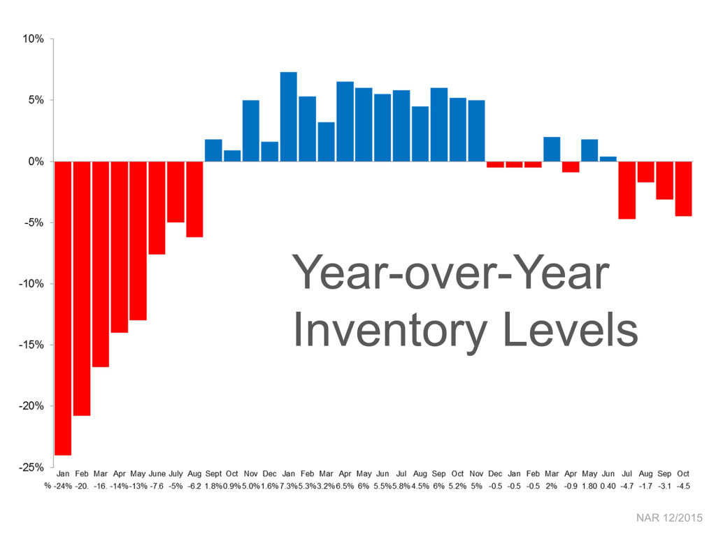 The chart below provided by the National Association of Realtors shows inventory levels for the nation from January 2013 to October 2015. One should consider, however, that this chart represents year-over-year changes, not actual available homes. So where we did see an increase in inventory across much of 2014, this was only in comparison to the radically reduced numbers of 2013.