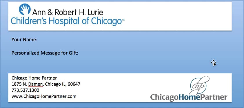 In addition, to share in the success that Chicago Home Partner has experienced this year, we will personally match every toy given with a $10 gift certificate to Target to help assist these families during the holiday season. Last year, we donated over 50 toys and $500 in gift cards! Together we are certain we can surpass those numbers, in hopes of bringing smiles to the faces of these fantastically brave children. Thank you in advance for helping to brighten this time of year for many children and their families. We wish you the best of holidays and a happy and safe New Year.