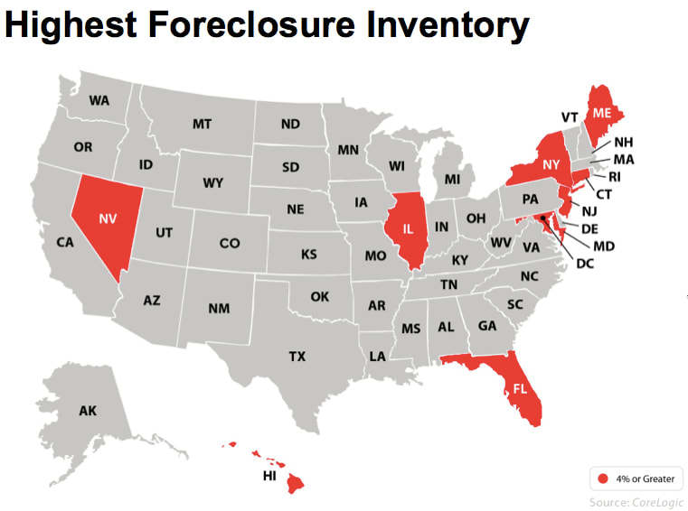 It takes an average of 697 days for a property to complete the foreclosure US Foreclosure States 2012 process in Illinois. Much of this is due to the fact that Illinois is one of 20 judicial states, where these properties are handled by local court systems. This judicial slowdown of the process has direct effects on the recovery process of housing prices as we are just not absorbing homes into the market that “went into foreclosure” in late 2010.