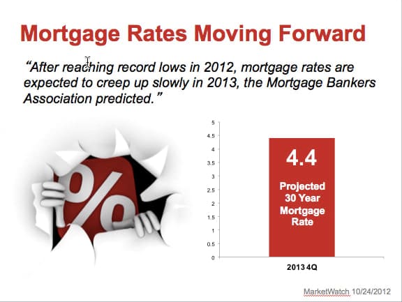 2012 rates ended at nearly 3.4% with little indication of near-term increases through mid-2013. However, a number of high-profile prognosticators have said mortgage rates will rise in 2013. According to the Mortgage Bankers Association (MBA), however, these low rates won’t last through 2013.