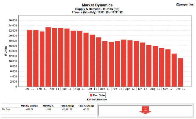 Chicago’s active “homes for sale” inventory was down 30% year-over-year in 2012. To put it in perspective, there were 23,000 homes for sale at the beginning of the Spring market in 2011. In 2012 at the same time period, there were 18,400. That’s a 20% reduction in homes to choose from in the market. Conversely, the number of properties going under contract in 2012 versus 2011 increased by 23%. More contracts – less inventory sets the stage for increased competition and a stronger real estate market.