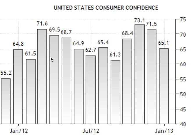 Consumer Confidence in the United States is an index reflecting consumers’ perceptions of current business and employment conditions, as well as their expectations for six months hence regarding business conditions, employment, and income. The 2012