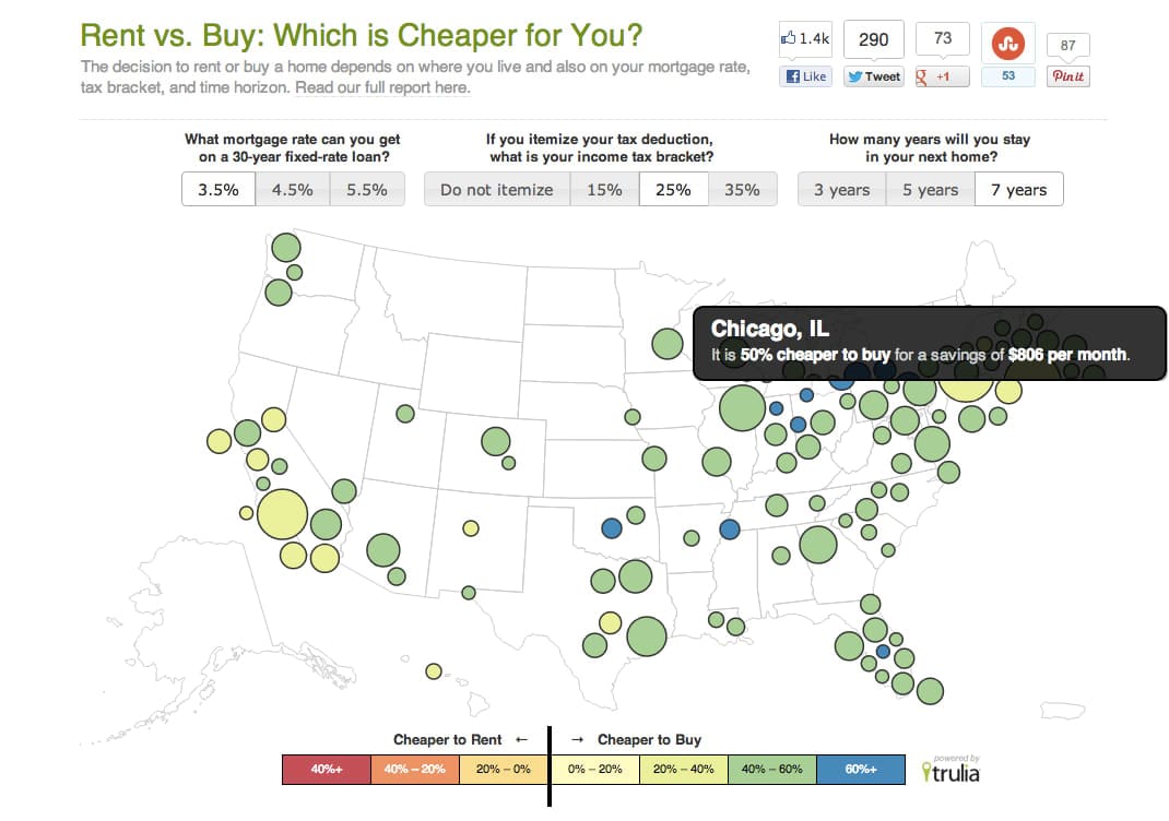 Rent vs. buy infographic TruliaIn Chicago, average rent prices have increased 20 percent from 2005 to 2012. Obviously, this varies on the location, size, and condition of the unit, however, renters are expecting to pay anywhere from $1700 – $3000 a month for a 2 bedroom in prime neighborhoods. This is good news for home sellers in the market as well. Rising prices, limited rental inventory, and continued low-interest rates have made the rent vs. buy discussion a serious discussion.